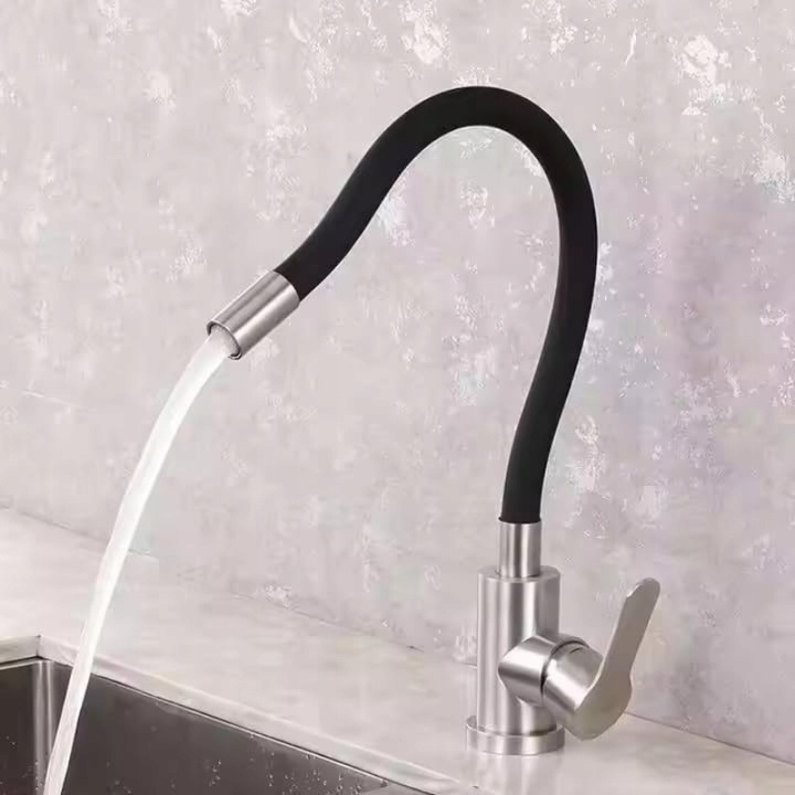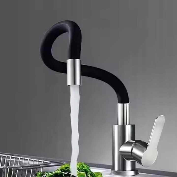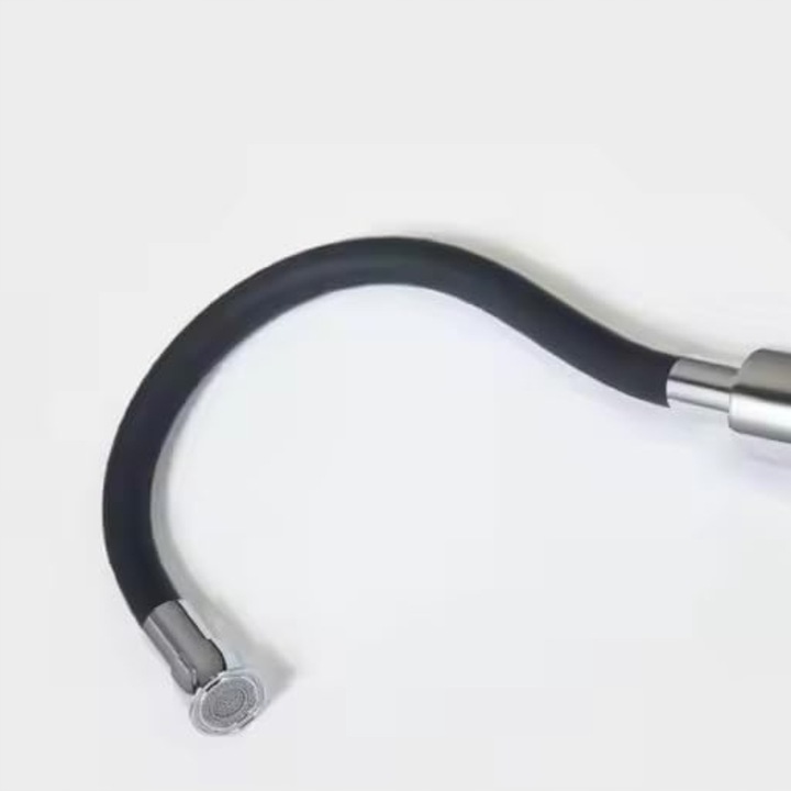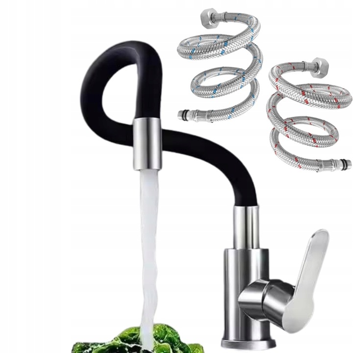 Nowoczesna bateria kuchenna z giętką wylewką doskonale wpasowuje się w każdą aranżację kuchenną. Jej czarno-srebrny kolor i prosta forma sprawiają, że staje się zarówno funkcjonalnym, jak i stylowym elementem wyposażenia.