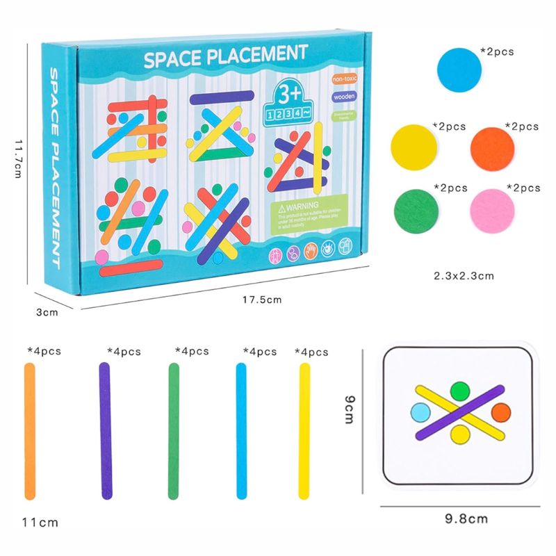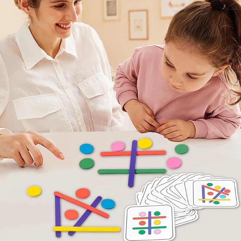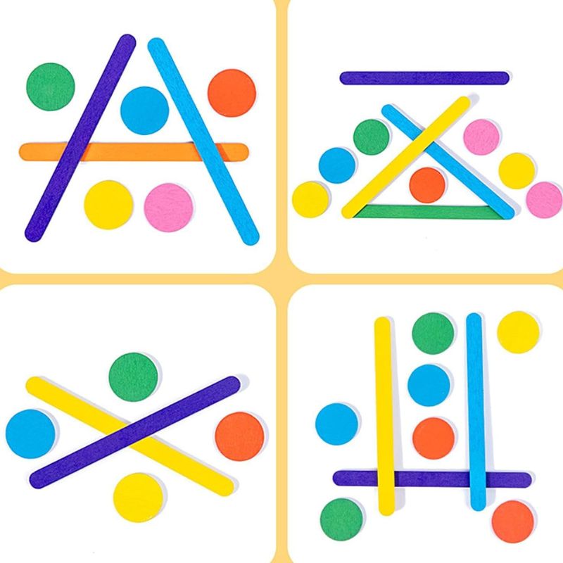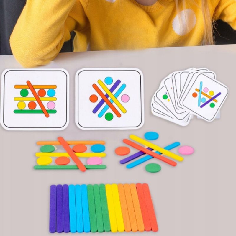 Zestaw edukacyjny oparty na metodzie Montessori, przeznaczony dla dzieci od 3. roku życia. Służy do nauki kolorów, rozwijania logicznego myślenia, koncentracji oraz percepcji wzrokowej. Zestaw zawiera drewniane patyczki i karty z zadaniami do odwzorowywania wzorów.