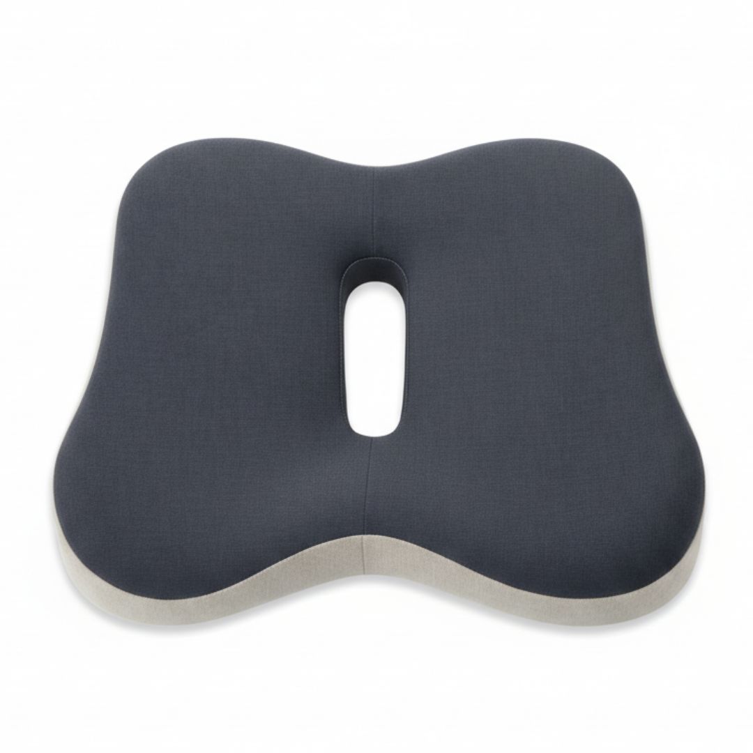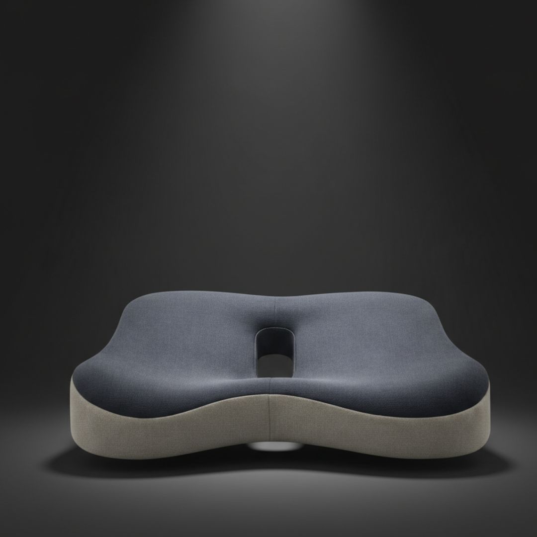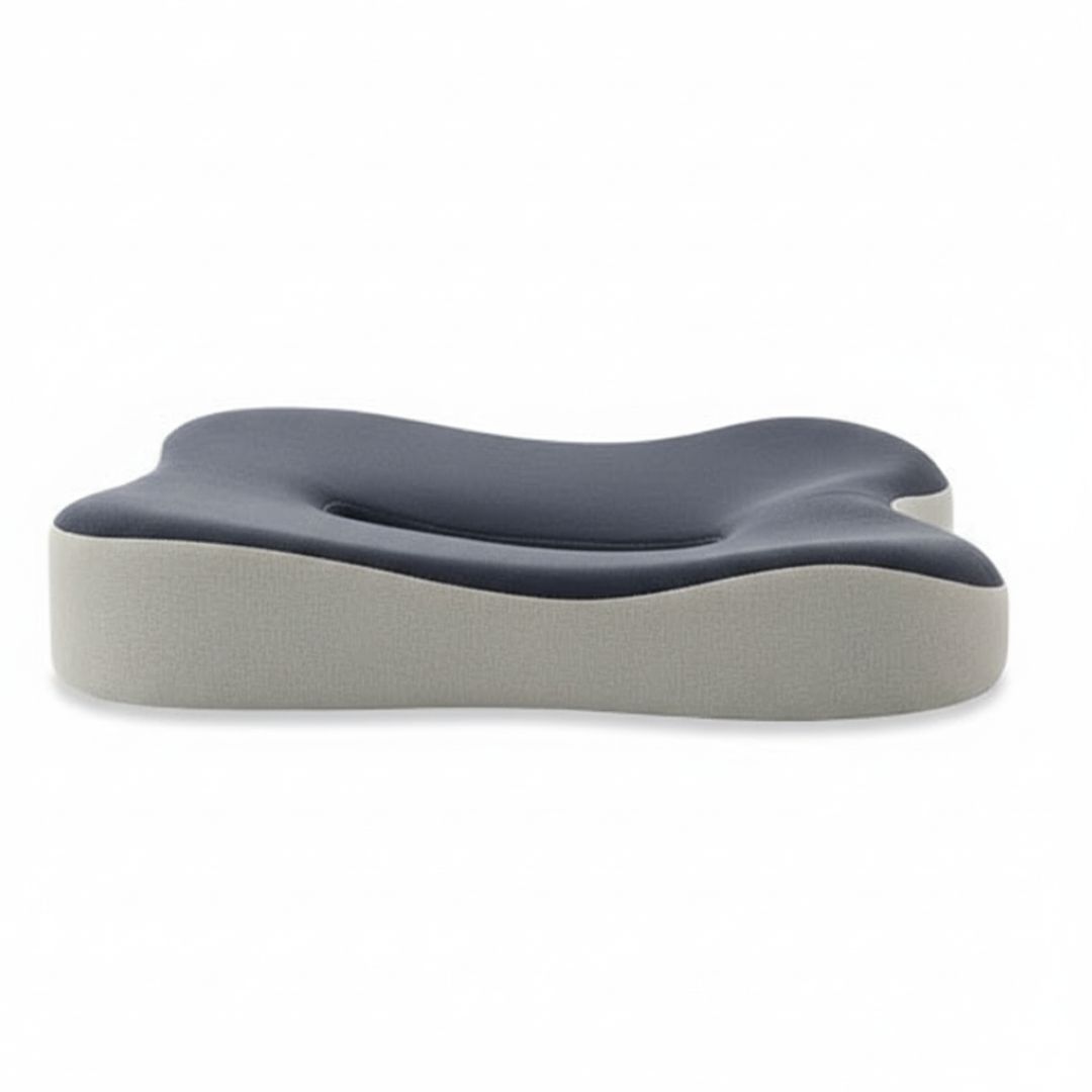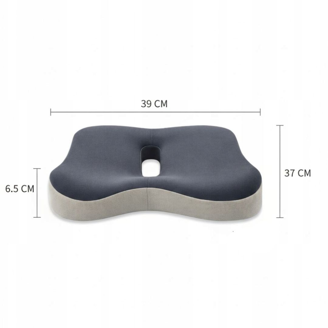 Specjalny kształt 3D wspiera miednicę, uda oraz odcinek lędźwiowy, pomagając utrzymać prawidłową postawę. Anatomiczne wycięcie w tylnej części poduszki zmniejsza nacisk w okolicy kości ogonowej i poprawia komfort siedzenia.