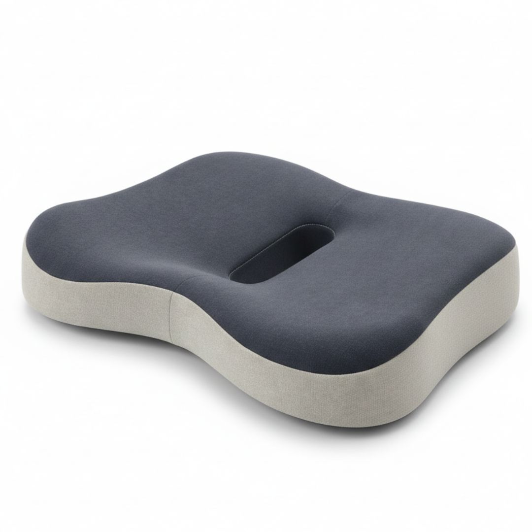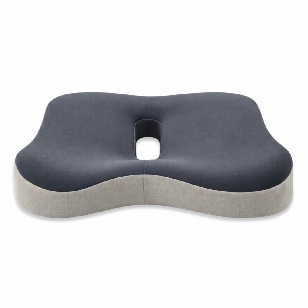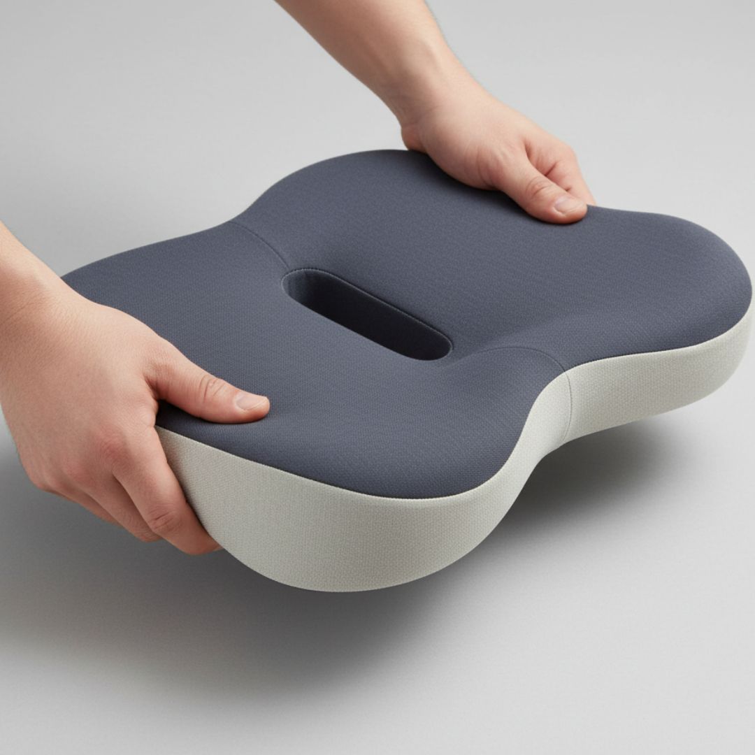 Specjalny kształt 3D wspiera miednicę, uda oraz odcinek lędźwiowy, pomagając utrzymać prawidłową postawę. Anatomiczne wycięcie w tylnej części poduszki zmniejsza nacisk w okolicy kości ogonowej i poprawia komfort siedzenia.