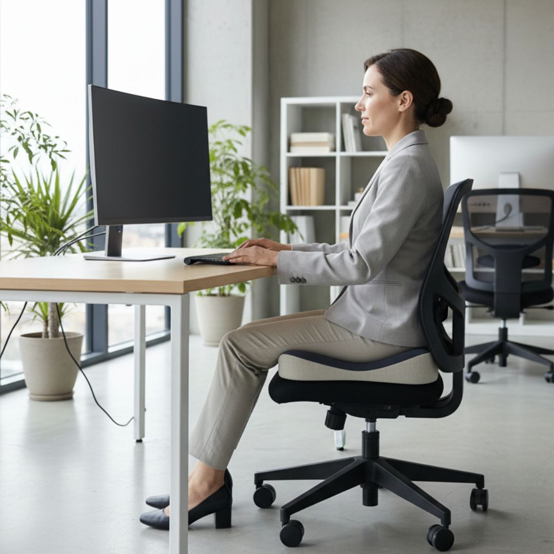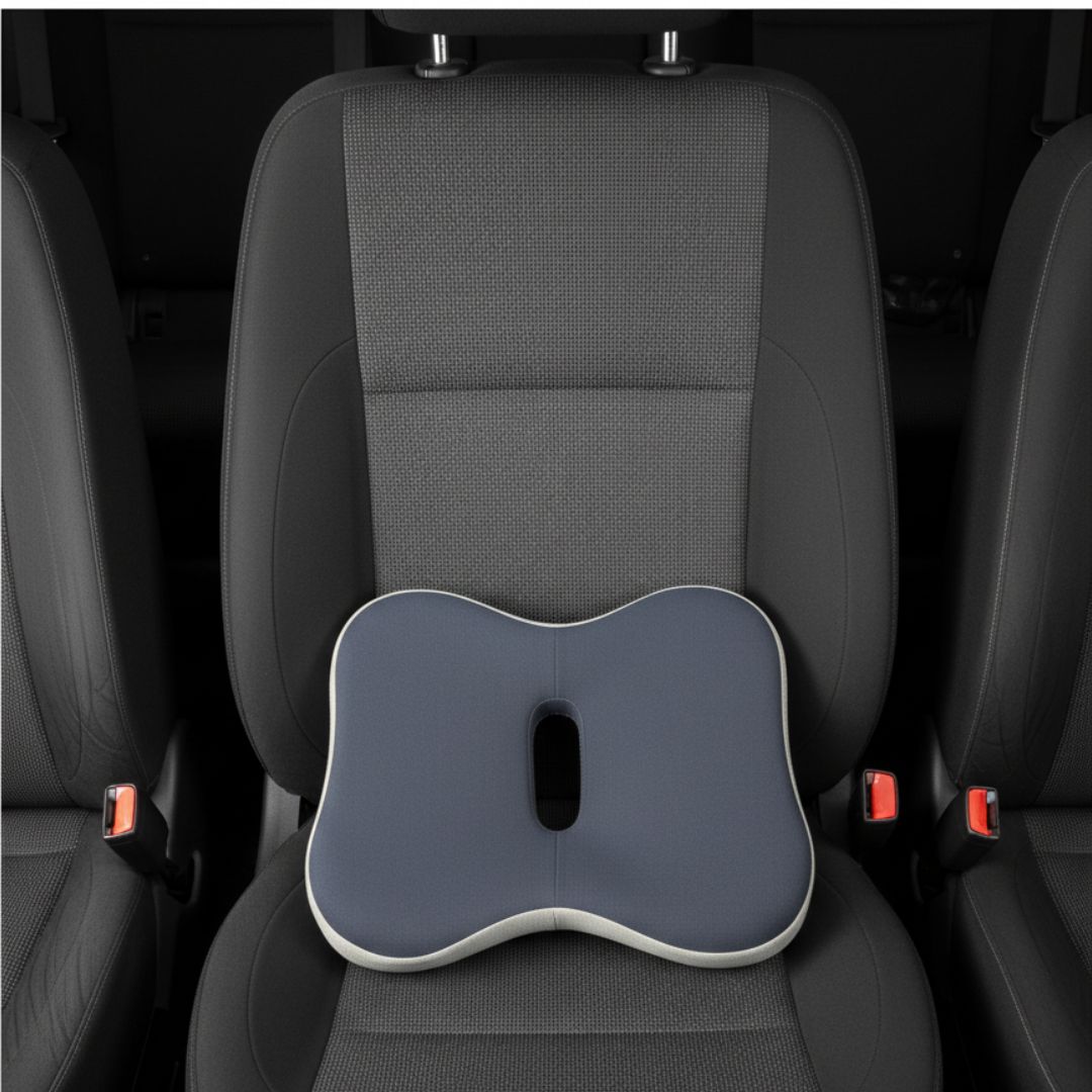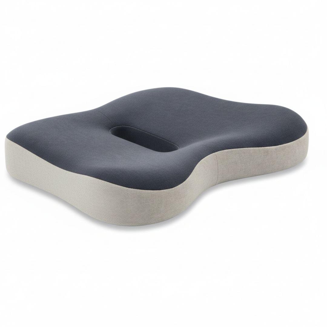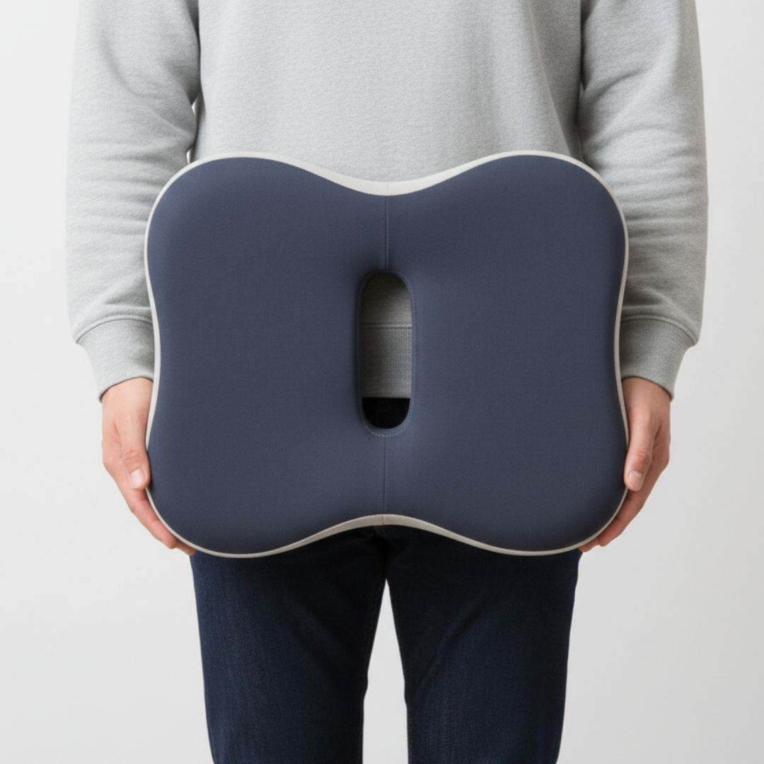 Specjalny kształt 3D wspiera miednicę, uda oraz odcinek lędźwiowy, pomagając utrzymać prawidłową postawę. Anatomiczne wycięcie w tylnej części poduszki zmniejsza nacisk w okolicy kości ogonowej i poprawia komfort siedzenia.