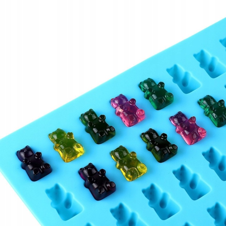 Forma silikonowa do wyrobu domowych żelek z wgłębieniami w kształcie misiów. Produkt może posłużyć także do tworzenia czekoladek.