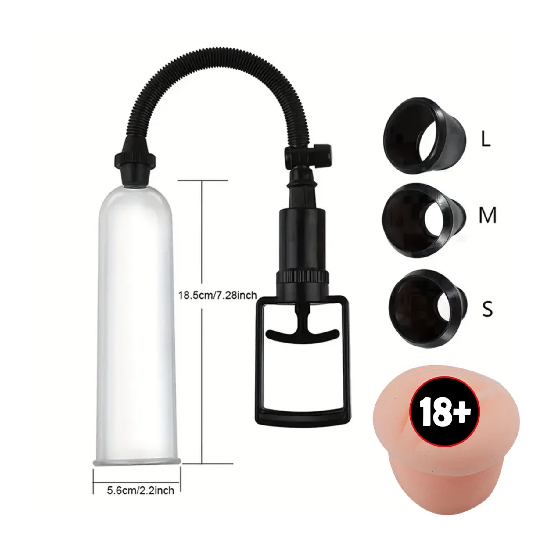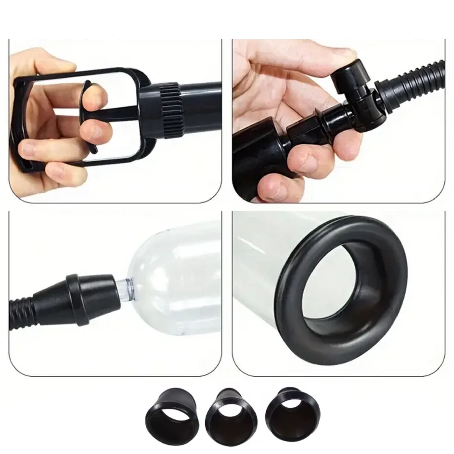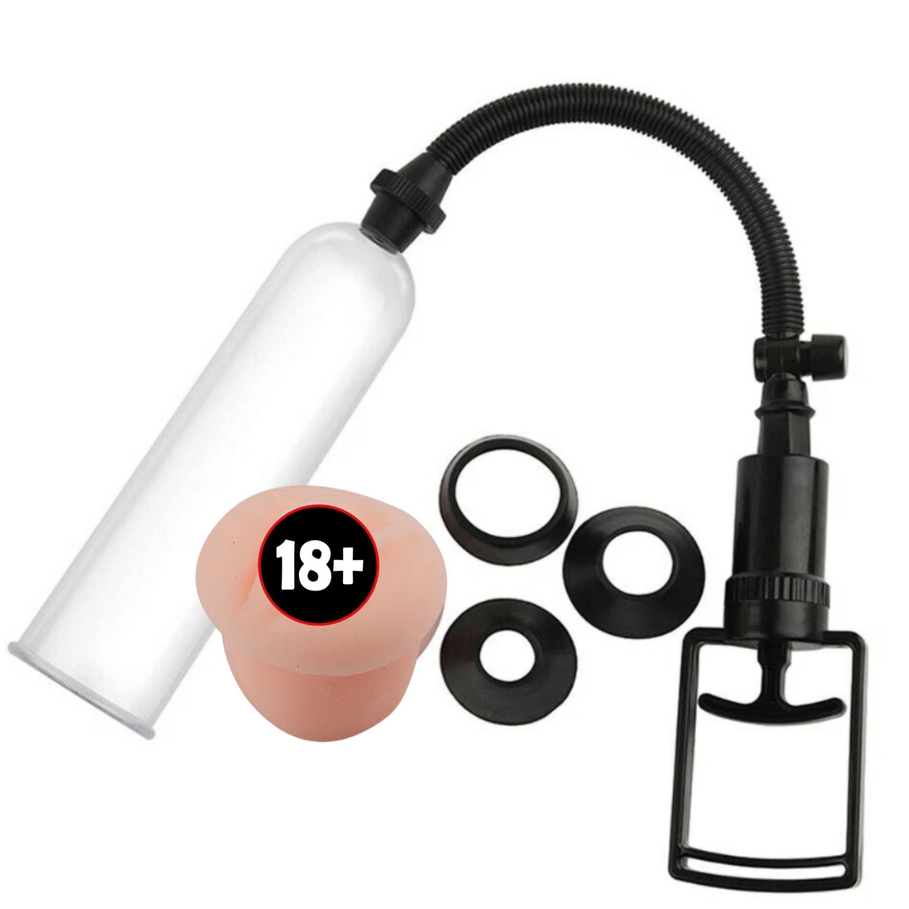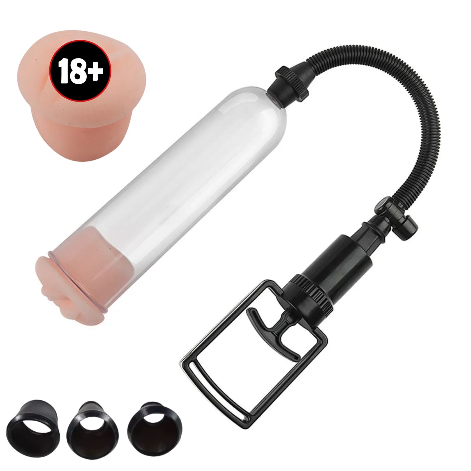 Zestaw zawiera wszystko, czego potrzebujesz: małą pompkę próżniową, gumowy rękaw oraz trzy wymienne czarne pierścienie. Dzięki nim możesz dostosować urządzenie do indywidualnych potrzeb i poziomu zaawansowania treningu. Produkt jest idealny dla mężczyzn, którzy chcą poprawić zarówno długość, jak i grubość penisa.