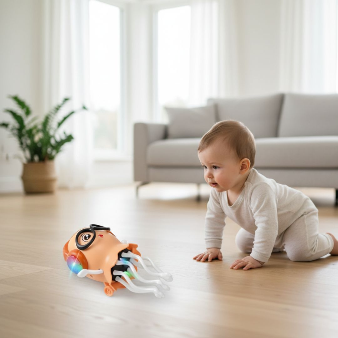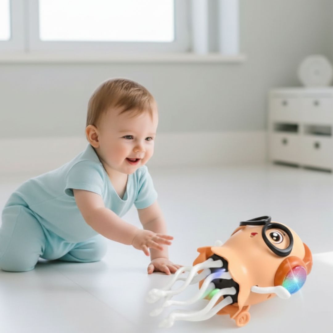 Ruchoma konstrukcja ośmiornicy została zaprojektowana tak, aby zachęcać dziecko do aktywności. Maluch, podążając za zabawką, naturalnie ćwiczy: