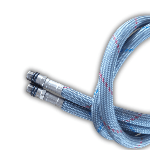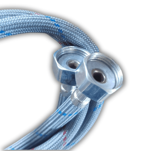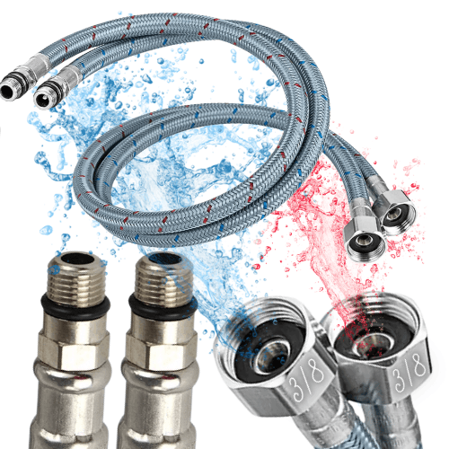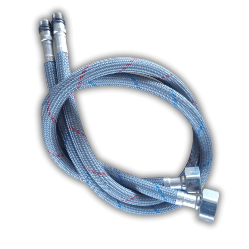 Zestaw dwóch elastycznych wężyków do podłączenia baterii w kuchni, łazience lub toalecie – po jednym do ciepłej i zimnej wody. Każdy wężyk ma długość 60 cm, z przyłączami G1/2 (nakrętka) x M10 (gwint zewnętrzny), pasującymi do większości instalacji.
