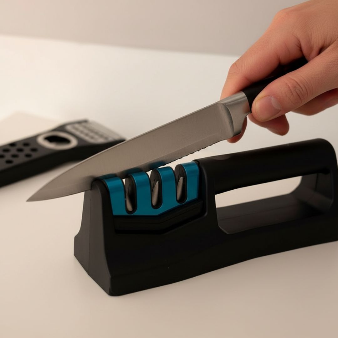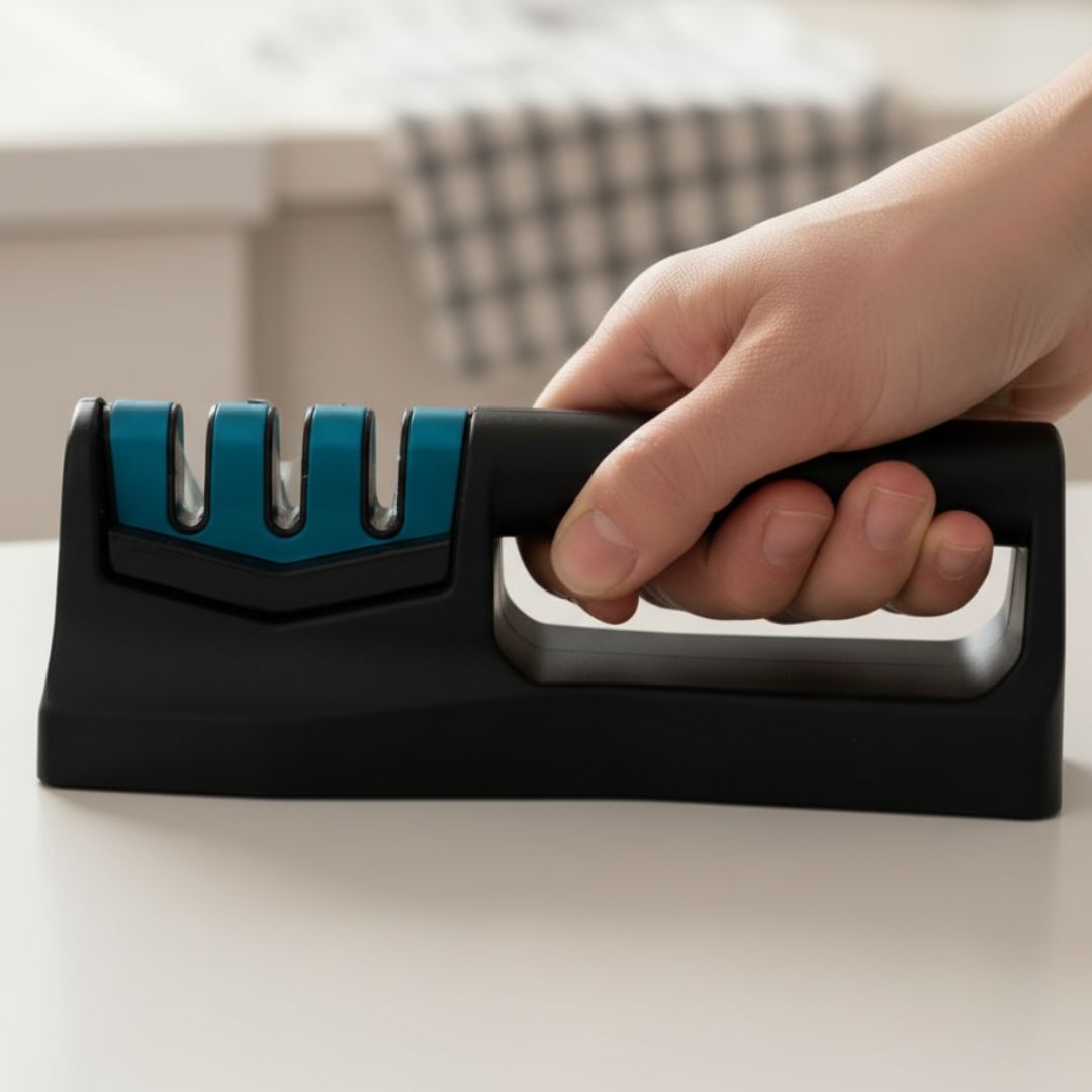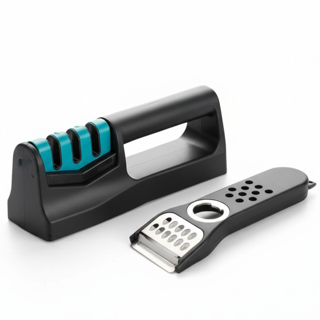 Trójfazowa ostrzałka do noży i nożyczek z wielofunkcyjną skrobaczką