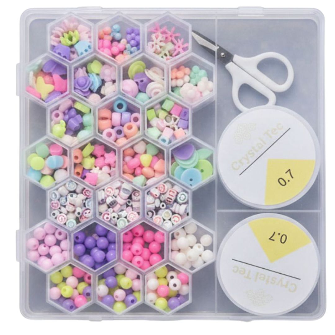 Zawartość: koraliki, zawieszki (ponad 300 sztuk), gumki 0,7 mm, nożyczki
